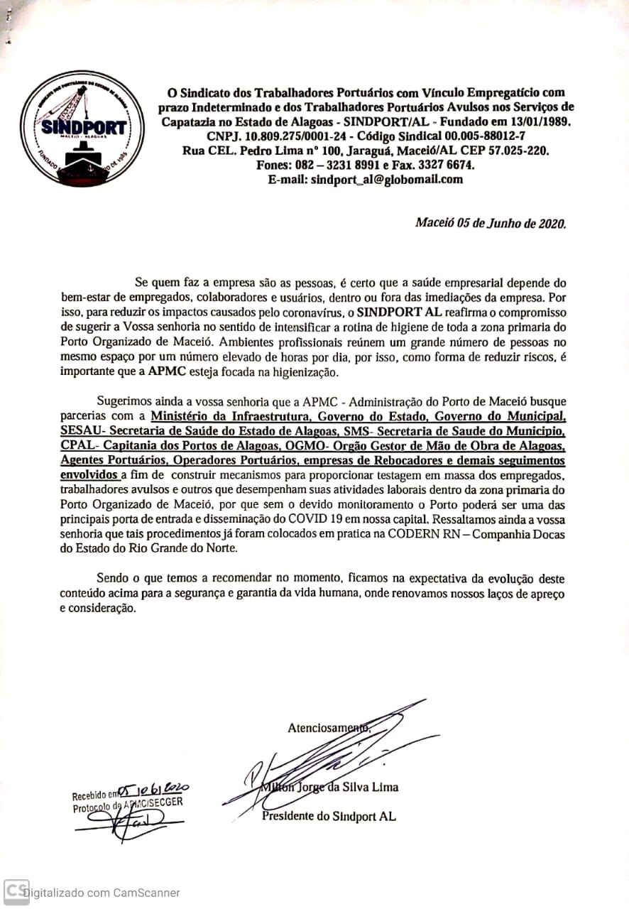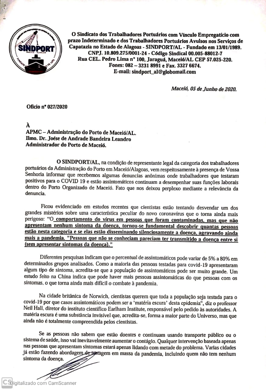 O pedido dos trabalhadores dos portuários alagoanos foi reforçado pelo Sindport/AL, em um ofício enviado a Administração do Porto de Maceió (APMC), nesta sexta-feira (5). No documento, além de ressaltar os perigos da contaminação pela Covid-19 no local de trabalho, mesmo com os funcionários assintomáticos, o sindicato também pede que seja realizada a testagem em massa dos empregados, trabalhadores avulsos e outros que desempenham atividades laborais dentro da zona primária do Porto Organizado de Maceió.