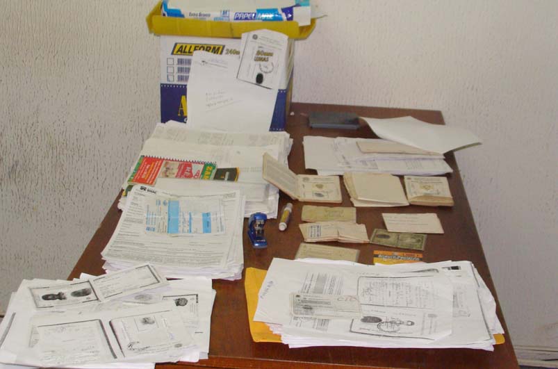 A Polícia Civil de União dos Palmares prendeu no inicio da noite de hoje (29) quatro acusados de fraudarem documentos de aposentados e falecidos para retirar empréstimos nas agencias avançadas do BMG e Bonsucesso instalados na cidade, inclusive, segundo o chefe de expediente Cícero Ildefonso Nascimento, com a participação de um vigilante do INSS. Estão presos o ancião Antonio Francisco da Silva de 68 anos, aposentado, residente na Rua do Jatobá, Erica Fernanda da Silva de 18 anos, do lar, residente na mesma rua e encarregada de arrumar informações para o esquema, a autônoma Maria Gorete Batista de Santana, de 38 anos, residente na Travessa José Domarques no centro e o vigilante do INSS Jailson da Silva Junior, de 38 anos, residente na Rua Edgar Sarmento também no centro da cidade.