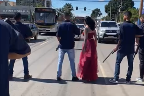 No vídeo que circula nas redes, a mulher aparece desfilando com um vestido de festa no meio da rua, rodeada por homens que seguram armas. No momento, para a tradicional “foto”, os envolvidos decidem formar uma barreira e parar o trânsito na via. Segundo a PCDF, a situação teria sido organizada para registros da prévia de casamento entre a mulher e um homem.