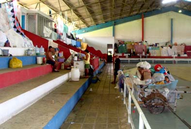Retornando ao acampamento, falamos com os desabrigados: no Ginásio de Esportes, além da desolação de quem perdeu tudo e da incerteza no dia de amanhã, as queixas: ainda não foi providenciada a “mistura” como é conhecida no Nordeste (carne, carne seca, galinha, e semelhantes) o adicional ao feijão, a farinha, ao arroz e ao macarrão, falta leite para as crianças e os idosos. Com relação à higiene, uma ordem determinou o fechamento do sanitário feminino; existe aberto apenas o masculino.