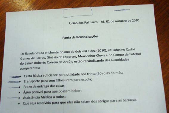 Das seis reinvidicações dos desabrigados, uma foge da alçada do prefeito que é o prazo de construção dos núcleos habitacionais quase que idêntica a não remoção das famílias para as barracas de lona; como medida paliativa, o prefeito ofereceu três kombis do município para uma comissão ir verificar na cidade de Murici como vivem os que perderam suas casas nas barracas “diferente da imagem que os desabrigados pensam ser” disse um participante da reunião.