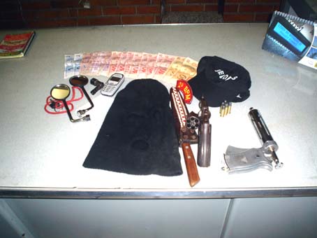 Com os bandidos foi apreendido um revolver calibre 38 com cinco munições intactas, uma face peixeira, uma balaclava, R$ 219,00 em espécie, um telefone celular, dois espelhos retrovisores de motocicleta, um protetor de velas para moto e uma seringa de vacinar gado. Quando foram detidos os suspeitos conduziam uma moto Honda placa MUR – 4335 – AL, pertencente ao mototaxista identificado como Dema, a qual, segundo apurou a polícia, havia sido alugada para a prática de assaltos.