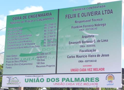 A atual ordem de serviços foi assinada no ultimo dia 03 de agosto pelo prefeito Dr. Areski Freitas em solenidade que contou com a presença de cerca de 80 simpatizantes da atual administração e alguns secretários municipais tendo os serviços sido confiados a Falcão e Oliveira Construções que é uma empresa palmarina que tem a frente o ex-secretário de Infra Estrutura do município Sr. Paulo César Felix.