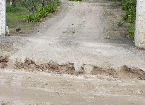 Pedras no leito da estrada, vazamento de água prejudicando construções (muros), e a principal atração da verdadeira ‘obra de arte’ da administração: exatamente na residência da entrada do editor deste noticioso, a máquina caprichosamente deixou construído um degrau, como se avisasse se a sua presença no local (desde 1991) fosse inconveniente.