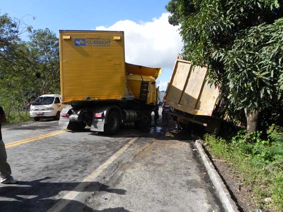 Testemunhas contaram aos policiais da PRF que atenderam a ocorrência que a carreta dos Correios placas COC-6420 licenciada em Guarulhos-SP de cor amarela ao descer um trecho em declive da rodovia no sentido Divisa Al-PE/União dos Palmares perdeu o controle do veiculo e foi de encontro ao caminhão azul placas KFP 2696 matriculado em Recife Pernambuco que com o impacto da batida foi jogado fora da pista.