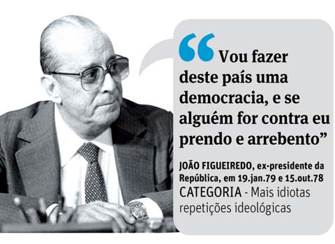 Na lista das "mais idiotas repetições ideológicas" está Figueiredo com a frase: "Vou fazer deste país uma democracia, e, se alguém for contra, eu prendo e arrebento".