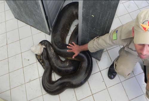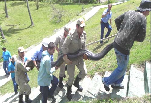 A equipe dos bombeiros chegou ao local às 11h30. Segundo o soldado Saulo Henrique, a cobra, que pesava cerca de 100 quilos, não ofereceu resistência e foi transportada para o veículo da corporação por oito homens.