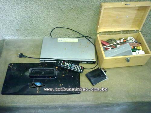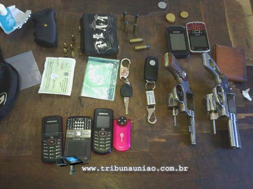 Com os acusados foi encontrado 6 telefones celulares, 2 revolveres com 4 munições intactas, 2 chaves de ignição para automóvel, algumas pratas de dinheiro, um cabo para revolver uma carteira porta-cedulas, uma bolsa porchete, 1 caixa de ferramentas e um TV plasma de 32 polegadas.