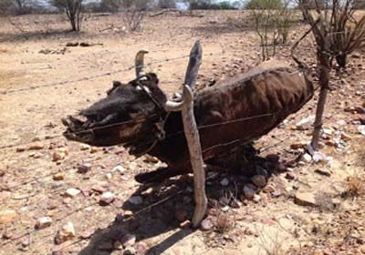 Quem também sofre com a falta d’água são os animais, principalmente o gado que sem pasto muitas vezes são encontrados mortos à beira da estrada, soltos por seus donos que sem condições de alimenta-los abrem as porteiras para que sem sucesso possam procurar o que comer, pois a paisagem seca denuncia o estado de calamidade do município.