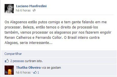“Alagoas é um ninho destas pestes, uma ratoeira, taca uma bomba naquela m... de Estado que só manda bandidos, vagabundos e calhordas do naipe de Renan e Collor para infectarem nosso país” diz Manfredini em um comentário postado por ele.
