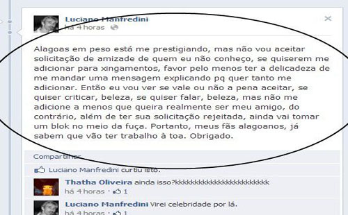 Manfredini, que pede que as pessoas “curtam e critiquem suas piadas” também se vangloriou de estar bloqueando alagoanos, que tentavam o adicionar para rebater as críticas , ele disse que eram seus “fãs alagoanos”. "Virei celebridade por lá".