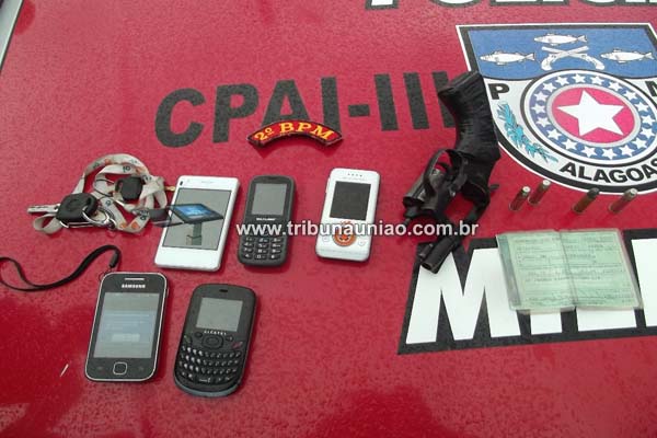 um revolver Taurus calibre 38 com quatro munições intactas, seis telefones