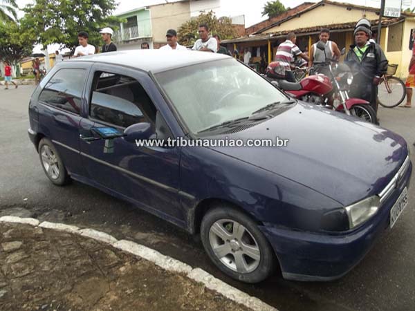 um carro gol azul escuro placas KIU-0755 de Rio Largo e uma motocicleta Honda