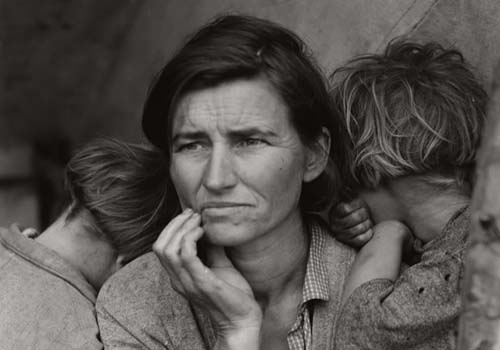 Um ícone da Grande Depressão e uma das fotos mais famosas dos Estados Unidos. Florence Owens Thompson, 32 anos, desolada por não ter comida para alimentar os filhos. Jornalistas americanos passaram décadas tentando localizar a mãe e seus sete filhos. No final dos anos 1970 ela foi encontrada, não prosperara muito. Vivia em um trailer. Fotografia: Dorothea Lange.