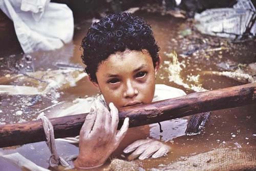 A fotografia mostra Omayra Sanchez, uma menina de 13 anos que ficou presa em entulhos deixados pelo deslizamento causado pela erupção do vulcão Nevado del Ruiz, que arrasou com o povoado de Armero, Colômbia, em 1985. Os socorristas não conseguiram resgatá-la. Ela morreu cerca de 60 horas depois de ficar presa. A fotografia ganhou o World Press Photo de 1985 e se tornou uma mais comoventes da história. Fotografia: Frank Fournier.