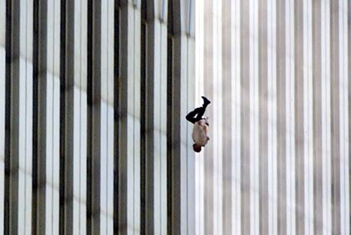 Fotografia feita por Richard Drew, fotógrafo da Associated Press, mostrando um homem caindo da Torre Norte do World Trade Center, em Nova York, durante os ataques terroristas de 11 de setembro de 2001. Cinco anos após os ataques, o homem foi identificado como Jonathan Briley, de 43 anos, funcionário de um restaurante instalado na Torre Norte do World Trade Center. Entretanto, oficialmente, sua identidade nunca foi confirmada. Fotografia: Richard Drew.