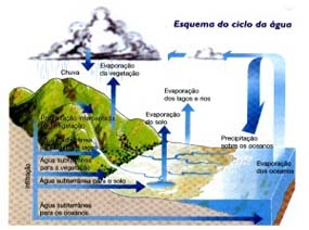 As nuvens formadas, quando ficam muito pesadas por causa da quantidade de água nelas contida, voltam à superfície terrestre em forma de chuva. Uma parte da água das chuvas penetra no solo e forma lençóis de água subterrâneos. Outra parte corre para os rios, mares, lagos, oceanos etc. Com o calor do Sol, a água volta a evaporar.