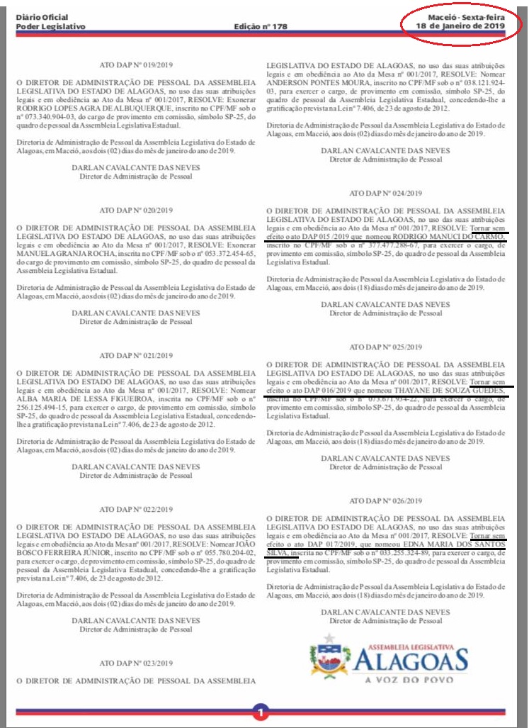 Como prometido pelo Pode Legislativo de Alagoas, os familiares da deputada Thaise Guedes, nomeados para receberem salários de mais de R$ 20 mil, foram exonerados nesta sexta-feira (18). Porém, apenas um nome não aparece no Diário Oficial da Assembleia Legislativa de hoje, o de Rosimeire do Nascimento Azevedo, a babá da deputada estadual.