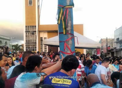 O tronco de eucalipto, com 20 metros foi carregado nos ombros dos fiéis, num trajeto de três quilômetros, até a Praça Basiliano Sarmento, onde é erguido nos braços, defronte a Igreja Matriz.