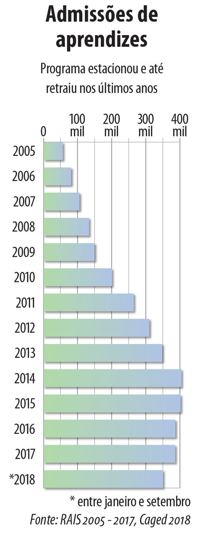 Entretanto, o pico de contratação de aprendizes, alcançado em 2014 e 2015 (de pouco mais de 400 mil jovens por ano) vem caindo, conforme o Boletim da Aprendizagem do antigo Ministério do Trabalho. No final de 2018, a diferença entre contratações e rescisões era de 449.151. Em contraste, mais de 4 milhões de jovens de até 24 anos (idade-limite para ingresso no programa) estavam desocupados — ou seja, desempregados, mas em busca de trabalho. Outros 2 milhões de crianças e adolescentes labutavam no trabalho infantil.