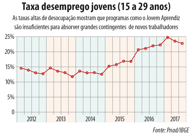 Entretanto, o pico de contratação de aprendizes, alcançado em 2014 e 2015 (de pouco mais de 400 mil jovens por ano) vem caindo, conforme o Boletim da Aprendizagem do antigo Ministério do Trabalho. No final de 2018, a diferença entre contratações e rescisões era de 449.151. Em contraste, mais de 4 milhões de jovens de até 24 anos (idade-limite para ingresso no programa) estavam desocupados — ou seja, desempregados, mas em busca de trabalho. Outros 2 milhões de crianças e adolescentes labutavam no trabalho infantil.