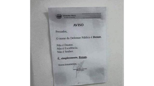 "Prezados, o nome do defensor público é Renan. Não é doutor. Não é excelência. Não é senhor. É, simplesmente, Renan", diz um papel colado na porta da sala do defensor público Renan Reis, que atua em Codó (MA). Segundo ele, foi uma medida tomada para demonstrar que não existe relação de hierarquia entre ele e as pessoas que atende.