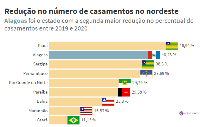 Alagoas registrou uma redução de 40% no número de casamentos realizados no ano passado, em comparação com o mesmo período de 2019. Um levantamento divulgado pela Agência Tatu, nesta quinta-feira (07), aponta que o estado teve a segunda maior redução do Nordeste, ficando atrás apenas do Piauí, que contou com 47% menos uniões oficializadas em 2020.