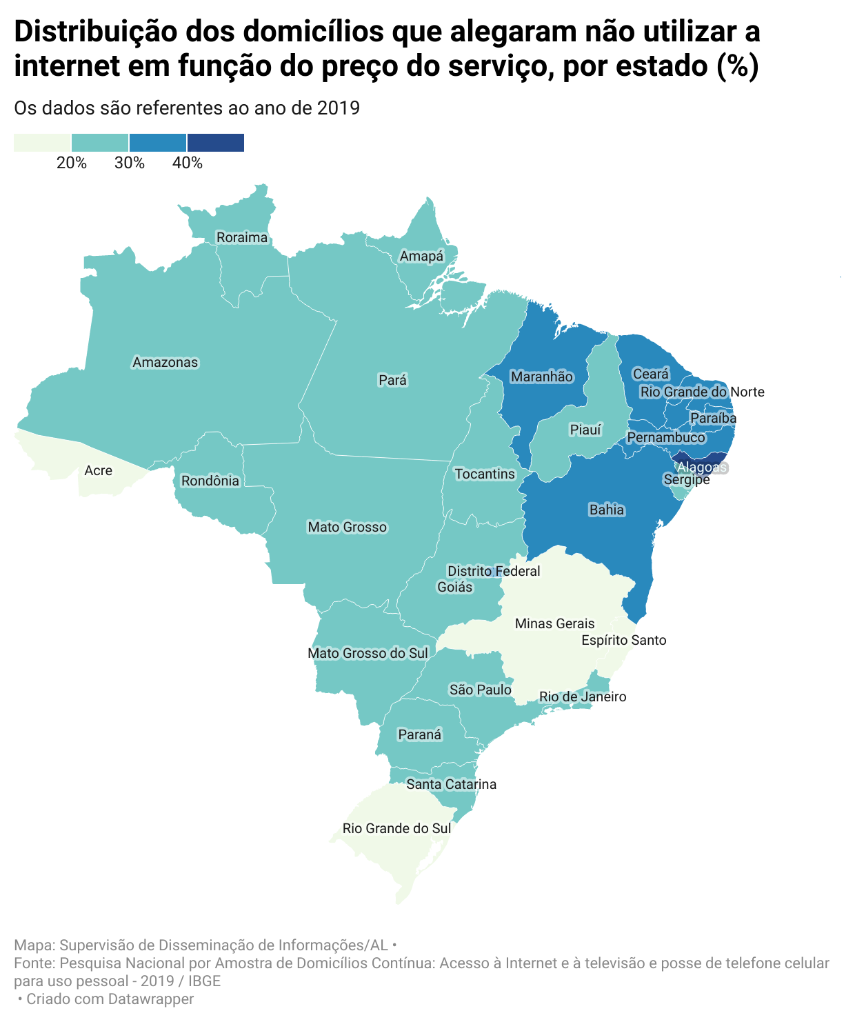 Apesar do aumento, o estado alagoano ainda tem a 4ª menor proporção de domicílios com utilização da internet, à frente apenas do Acre (71,4%), Maranhão (67,4%) e Piauí (67,3%). O Distrito Federal registrou a maior proporção de lares com acesso à internet em 2019: 94,4%.