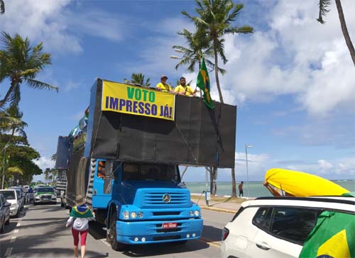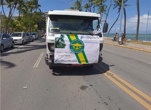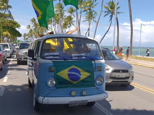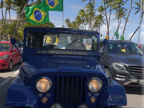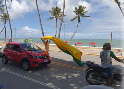O Movimento Brasil reuniu, neste 1º. de maio, centenas de simpatizantes do presidente Jair Bolsonaro, que vestidos de verde e amarelo ao som do Hino Nacional percorreram desde o Corredor Vera Arruda na Jatiuca até o centro da cidade. Se estima que cerca de 800 carros ‘puxados’ por dois trios elétricos que divulgavam palavras de ordem e a música de Dom e Ravel ‘Eu Te Amo Meu Brasil’.