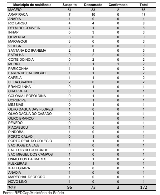 Conforme os dados divulgados, Alagoas tem 96 casos suspeitos da doença, aguardando resultado de exames. Até o momento 172 casos suspeitos foram notificados, destes 73 já foram descartados.